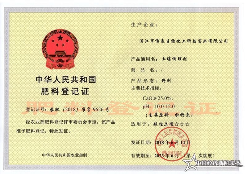 (湛江市博泰生物化工科技實(shí)業(yè)有限公司生產(chǎn)的土壤調(diào)理劑登記證)