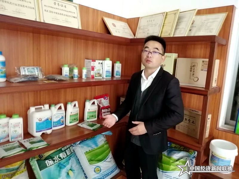 (湛江市博泰生物公司產(chǎn)品部負(fù)責(zé)人詹少波給記者介紹土壤調(diào)理劑系列產(chǎn)品的情況)