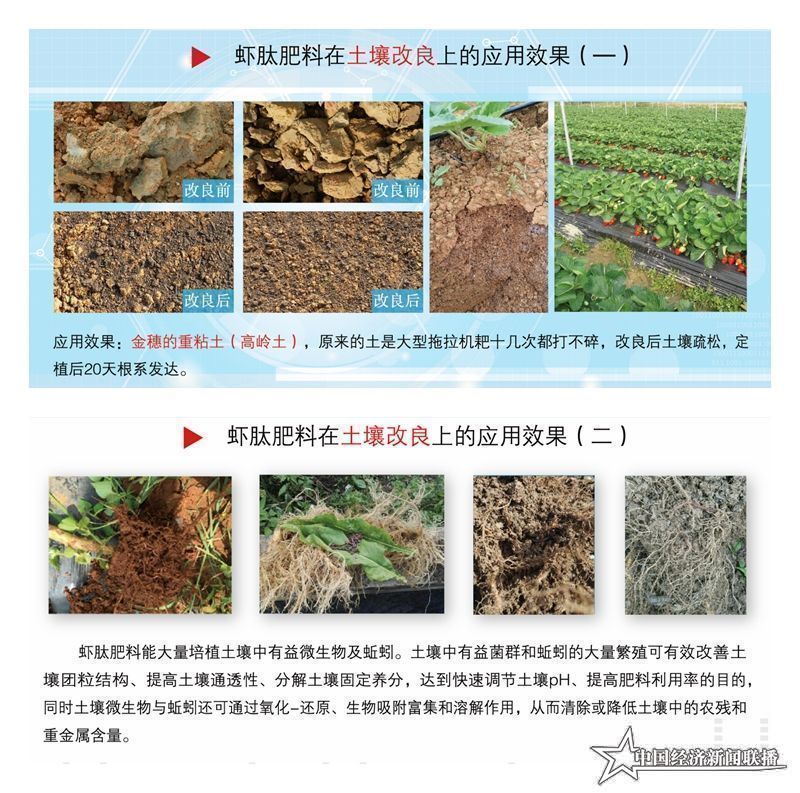 詹少波大體介紹了公司的情況之后,指著貨架上一款名為“蝦肽海螺甲殼素”的產(chǎn)品,對記者說,這就是公司現(xiàn)在生產(chǎn)的新一代產(chǎn)品土壤調(diào)理劑,是公司“健康土壤培育工程技術(shù)研究院”的最新研究成果,利用新一代的萃取技術(shù)從牡蠣殼、海螺殼中提取含海洋甲殼素、鈣、鎂、硼、鋅、鐵等養(yǎng)分,并添加蝦肽氨基酸進(jìn)行絡(luò)合,生產(chǎn)出高活性的土壤調(diào)理劑產(chǎn)品。它的原理就是通過給土壤補(bǔ)充活性有機(jī)螯合物,如螯合鈣,螯合鐵,螯合鎂等。該土壤調(diào)理劑能快速調(diào)整土壤ph值和土壤團(tuán)粒結(jié)構(gòu),增大了土壤環(huán)境的通透性能,為各種有益微生物生長繁殖提供了條件。通過監(jiān)測,土壤有益微生物量大幅提升,同時(shí)也促進(jìn)蚯蚓的大量繁殖生長,以此來清潔土壤,平衡土壤微生態(tài),恢復(fù)土壤活力,從根源上解決我國土壤問題,利用率高,快速高效。