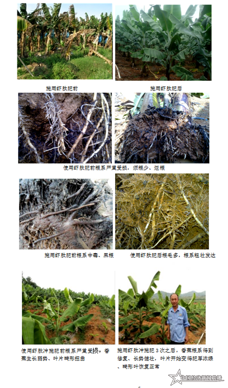 詹少波說,在2012-2013年期間,由廣東海洋大學(xué)與湛江博泰公司共同組織蝦肽氨基酸系列肥料在湛江市徐聞現(xiàn)代化農(nóng)業(yè)公司的香蕉基地對其香蕉枯萎病的應(yīng)用試驗(yàn),效果非常顯著。當(dāng)時(shí)發(fā)病較早的植株不能抽蕾,病株抽蕾后蕉果發(fā)育不全,大部分病株凋萎倒垂,通過博泰公司技術(shù)指導(dǎo),選用抗病的香蕉品種,施用蝦肽氨基酸系列肥提高香蕉的抗病蟲害的能力,使香蕉生長旺盛,再配合施用蝦肽肥保根防病栽培技術(shù)對香蕉根系根結(jié)線蟲有非常好的防治效果,使根系的生長好、根壯、須根多。香蕉生長好,長勢齊整,蕉葉厚綠,發(fā)病少,且香蕉枯萎病病情指數(shù)較低,病株仍然可以抽出正常蕉果,產(chǎn)量有了很大提高。