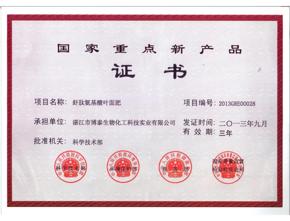 湛江博泰生物化工科技實業(yè)有限公司所研發(fā)生產(chǎn)的蝦肽肥在2013年9月被國家4部委聯(lián)合授予國家重點新產(chǎn)品證書。